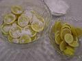 漬け始めから3〜4か月すれば、レモンの酸味の角が取れて、さわやかな風味のシトロン・コンフィになる。(6か月を超えるとあめ色に変色し、指で押さえるとつぶれるように柔らかくなり、使い勝手がよくなる。・・・手前は10か月漬け込んだもの)