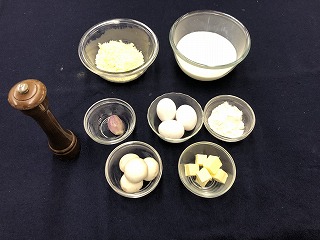 鍋にバターを熱して、そこに小麦粉を加える。粉気がなくなるまで焦がさないようにしっかり炒めたら牛乳を加える。牛乳に濃度がついたらグリュイエールチーズと卵黄を加えて手早く混ぜ合わせる。