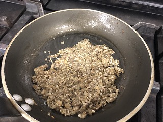 フライパンでみじん切りにしたエシャロットとマッシュルームをバターで炒める。炒めあがったらボウルに取り出して冷ましておく。
