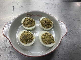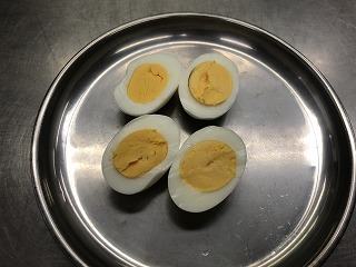 固ゆで卵を作り、殻を剥いて半分に切り、黄身を取り出す。