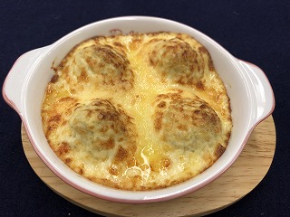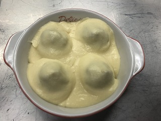 グラタン皿全体ににソースモルネーをかけて、上からグリュイエールチーズをふりかける。