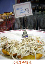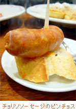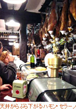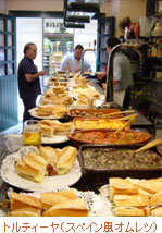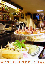 ピンチョスは、肉、野菜、魚介、珍味とあらゆるものを使っています。なかでも、季節にもよりますが、うなぎの稚魚(アンギュラス)、鱈の喉の身(ココチャス)、スペインのソーセージ(チョリゾー)、スペインオムレツ(トルティーヤ)等は必ず食べてみたいものです。ある時、偶然にトルティーヤの出来立てを食べました。普通は適当な大きさに切って大きなお皿の上に並べてあるので、冷たい状態が多いのです。この時はタイミングが良かったのでしょう。新しいものと差し替えているところに出くわしたのです。トルティーヤがあんなにフワフワ、ホクホクで美味しいものとは思いませんでした。 |