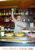 さて、実際にバルに入ってみましょう。一番混みあう夕刻の6時頃に行くと、カウンターの前にはすでに3重ほどの人垣が出来ています。店によっては通りまで客が溢れています。人垣を掻き分けてやっとカウンターの前までたどり着き、いざ注文。しかし、スペイン語がわからない者にはここからが大変です。目の前に並んだピンチョスは指をさして注文できるのですが、黒板に書かれたものは読めないし、しゃべれない。飲み物のほうも、ビールやワインのスペイン語は覚えたものの、ビールは何と100mlからのサイズが選べるのです(ワインも同様)。こうなるとジェスチャーしか手はありません。身振り手振りでやっとの思いで飲み物と食べ物を手にしても、今度は食べる場所が見つかりません。結局店の外の路上で食べることとなりました。 |