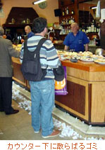 《流行っているお店ほど床が汚い》。これも何軒か回っているうちに気がついたことです。バルではピンチョスの串や、オリーブの種、紙ナプキンは全てその場の床に捨てるのです。だから、混雑しているお店ほど、床にはあらゆるものが散乱しています。勿論閉店前にはきれいに掃除されます。 |