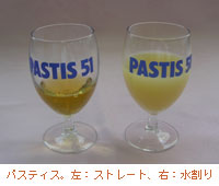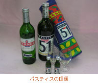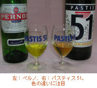 パスティスの種類は何種類かあり、ラベルに51(フランス語でサンカンテアン)と書いてあるパスティス51、またリカール、ペルノなどがよく知られています。51とペルノの違いは写真を見てもわかるように、まず色が明らかに違います。またパスティスとリカールには原料にリコリスが入っています。 味の方は各自の好みになってしまいますね。