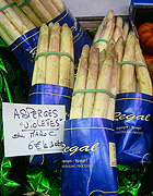 アスパラガスはホワイトとグリーンに大別されますが、元は同じで、栽培方法が違うだけです。ホワイトは発芽後に土寄せをして日光をあてず軟白させたもの、グリーンは土寄せせずにそのまま育てたものです。さらに、芽が地上に出たらすぐに収穫する、穂先が紫がかったヴィオレット(フランス語で「紫色の」という意味)という品種もあります。 ビタミンを豊富に含み、アスパラギン(少し前ですが栄養ドリンクの名前になるほど)といわれるアミノ酸の一種やルチンも多く、血圧をさげたり利尿促進作用があります。