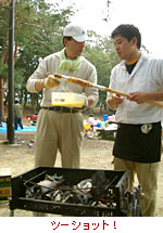 : まあーこんなトークしながら毎回、楽しくやってます。僕らがBBQするときは食材には糸目をつけません。近くのスーパーで、てー訳にはいきません。手に入りにくい食材は現地に直接TELしたり、輸入業者に問い合わせたりしてます。それと最近、ドラム缶を半分に切ったものを頂きましたので使用していますが、これは最強!どんなものでも焼ける!出来る!!後は、ひとつ一つの小さな知恵、一回一回の経験の積み重ねで、バーベキューをより美味しく楽しむことが出来ると思います。そして、もっとも大事なことは、ゴミの処理!最後まで気をつけたいものです。もちろん、火の後始末もお忘れなく!!おーい!あつみ君、今度、子豚丸一頭焼くぞーー。