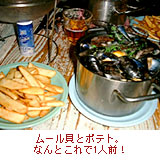 これらのビストロで出される料理は、写真(下の右)のように大量に盛られたムール貝、それに負けずに大盛りのじゃがいものフライなど・・・、もうこれでお腹いっぱいになりますよね。これにきりりと冷えた白ワインがあれば、もう何杯でもグイグイ飲めちゃいます。酒好きにはたまらないですよね