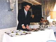 高級レストランで、ダイナミックに盛られた大皿料理が華麗な手さばきで美しい一皿に変わる瞬間