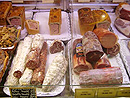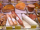 田舎風のパテ(パテ・ド・カンパーニュ)もどこに行っても見かけます。豚肉とレバーで作るものです。豚肉の赤身、脂身、レバーを挽肉にする。スパイス、酒、でんぷん、ハーブを混ぜてよく練る。焼き型に豚の網脂を敷く。前出の生地を詰め、オーブンで焼く。作る人によって、味はもちろん、肉の荒さやレバーの分量による舌触りはまちまちです。一切れ単位で買うことができます。フランスパンにはさんでサンドイッチにして、ピクニックなどにもって行きます。