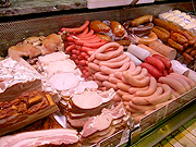 ソーセージにも色々種類があります。まず、乾燥したソシソン・セックSaucisson sec(日本ではサラミと呼ばれることが多い)と、ソシソンSaucisson(太さは太いものだと直径15cmもあり、長さも長いものでは30cm以上ある)と、ソシスSaucisse(日本ではウィンナーとかフランクフルトと呼ばれるようなもの)に大きく分けることができます。これには地方の名のついたものも多く、リヨン風、トゥールーズ風、ストラスブール風など、内容物の基本は豚肉ですが、その豚肉の挽き方(細かさ)の違い、味付けスパイスの配合の違い、また木の実や塩漬けタンが入っているなどと違いはさまざまです。ソシスの調理法としては、茹でる(蒸す)と、焼く(炒める)の2つがあり、焼いたものにはポム・フリット(フレンチポテト)が添えられます。