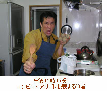 「しゃぁけど、問題はチーズやなァ。とろけるチーズぐらいでは、あの伸びは出ぇへんしなぁ」。居並ぶチーズを眺めていると、目にとまったのが「さけるタイプ」のスティック状の物。昔、学生を引率して見学に行った、チーズ研究所の所長さんの姿がフラッシュバックしました。「確かチーズを作る工程で、ビヨーンと<伸びるモン>が出来て、それをヒントにこの商品を作った、て言うてはったな」。両手に柔らかくなったその<伸びるモン>を持ち、ゆっくりと左右に手を広げていくと、ちぎれずに伸びていくシーンを写真に収めた記憶が・・・。よし、考えるよりやってみる。 家に帰ってじゃがいもを茹でて裏ごし、そこへ牛乳と小さく切った「さけるチーズ」とを混ぜて溶かし、ぐるぐるかき混ぜて引っ張ってみると、ものの見事に「ええ感じやんけ」。かくして、コンビニ版「アリゴ」の完成となりました。「やってみるもんやなぁ」と一人ほくそ笑みながら悦に入る・・・が、お皿に山と盛られたアツアツの「コンビニ・アリゴ」を目前に、時計の針は翌日になった事を示し「あかん、今からこれ食べたら、めっちゃ太るやろなぁ・・・でも、しっかり味みとかんな・・・どうしよう、ドキドキ・・・」。