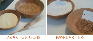 デュラム小麦の粒は外皮を取り除くと黄色くっぽく、乾燥パスタの色はこの色に由来するというわけです。写真でもデュラム小麦を挽いたものと軟質小麦を挽いたものではずいぶんと色が違うのがわかります。