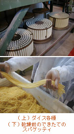 そしてこの押し出された長い状態のパスタを乾燥させ、カットして袋詰めにしたものが、皆さんがよく見ている市販の乾燥パスタというわけです。乾燥時間や温度は会社によって違いますが、A社では78℃でスパゲッティなどのロングパスタは11〜18時間、ペンネなどのショートパスタはカットしてから8時間乾燥させています。