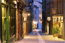 薄暮のリヨン旧市街大通り。ビストロが並びます