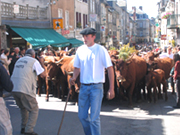 お決まりのベレー帽に杖の格好で牛たちを先導する