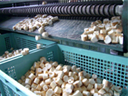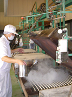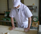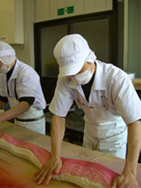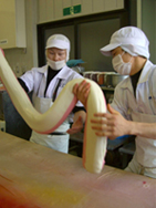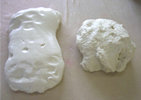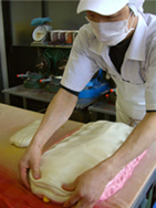 右:グルテンともち粉をミキサーで混ぜたもの左:右の生地を練り機で練りこんだもの。練りこむことで均質になり、コシを出し、空気を抜く