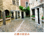 その中世の街とは、パリと並ぶ美食の街リヨンから北東へ35kmほど離れた小高い丘の上にあるぺルージュです。城壁に囲まれた直径約200mの小さな街。石畳の道も広場も家々も教会も全て中世の面影を濃く残しています。(映画「三銃士」のロケ地にもなったほどです。)ペルージュは、イタリアのサッカーチームでおなじみの「ペルージャ」、そうです、イタリア中部の町、ペルージャから来た人々によって作られました。中世には織物の街として栄えていたのですが、19世紀末に鉄道や幹線がこの街を迂回した為、人口が1500人から80人まで減ってしまいました。その後20世紀初めに街の復興運動が起こり、住民も戻ってきたのです。 |