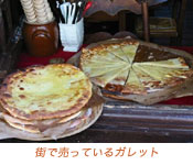 ここのレストランのデザートがあの心の片隅にあった「ガレット」なんです。直径がなんと50〜60cm!このガレットを焼くかまども昔どおりのものが使われ、その様子が通りからも眺められるようになっていて、厨房の横の出窓から買う事も出来ます。このガレットの特徴は、発酵させた生地をピッツァのように大きく薄く伸ばし、膨らみすぎないよう二次発酵させずにバターと砂糖を散らして高温で短時間で焼くこと。表面がカリッと、中がふんわり柔らかい食感に仕上がります。現在の菓子店では、なかなか見かけられないタイプではないでしょうか。 |