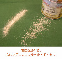 薬味にはフルール・ド・セル(塩の花という意味)という最初に塩田の表面に結晶化する塩が、高値ですがお勧めです。この塩の甘みが肉や野菜の味をぐっと引き立ててくれます。 |