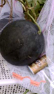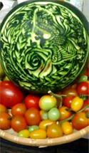 【収穫と料理編】 スイカは売り値の高い黒スイカ。毎年の連作は連作障害出て初心者は難しいとの事で、今回限りのスイカ作りです。せっかく収穫できた一玉、すぐに食べるのは惜しいので、スイカに花と鳥を彫ってみました。