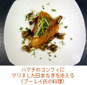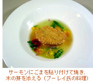 そのようなブ−レイ氏が取り入れている日本の食材は、ねぎ、ゆず、白ごま、木の芽、穂じそ、しょうがなど、どちらかというと香りづけのものが主でした。これら日本やエスニック、あるいは中国料理などの素材を斬新な発想で取り入れて複雑で洗練された味わいの料理に仕上げているブーレイ氏は、ニューヨークでトップシェフの座を守り続けています。 |