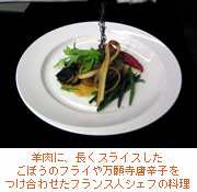 たとえば、牛乳にスモークをかけてトロっとさせ、わさびを少し加えてミキサーで泡立てたものを、ラングスティーヌのカルパッチョにかけるというオードブルがあります。あるいは、料理に添える野菜に、日本の洋野菜だけではなく和食の野菜である京にんじん、山芋、さつまいも、小いも、オクラ、大根、れんこん、水菜、菊菜などを選んでフランス料理風にアレンジしたり、またソースにも日本の調味料である醤油はもちろん味噌、梅肉などを使って、今までのクラシックなフランス料理を原点として新しい食材だけを求めていた時代とは少しスタイルの違った、異文化圏の料理を融合させようとするフュージョン的な料理が出てきているように感じられます。 |