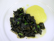 そして、ヴェネトのイカの墨煮の付け合わせとして欠かせないものがポレンタ。これはとうもろこしの粉を粥状に炊いたもので、炊きたてはもちろん、冷やし固めたものをカットしてフライやグリエにしたり、食べ方も様々です。黄色いポレンタが一般的ですが、白いものもあり、最近では日本でも手に入るようになりました。白いポレンタはデリケートな魚料理に合うとされていますが、今回は手に入りやすい黄色いポレンタを添えました。