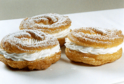 | H: そうだね。シュー生地の基本をしっかり思い出してと・・・・。今回は中にカスタードクリームの上にホイップクリームを絞って詰めてあるけど、クレーム・ディプロマットやチョコレート風味のクリームでもおいしそう!! |