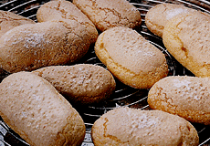 | M: そう、釜に残っている熱を利用してみたいね。パンを焼くほど時間もかからないし、そんなに強い火もいらない。そのころのビスキュイは、乾燥してカリカリした感じだったらしいし。 |