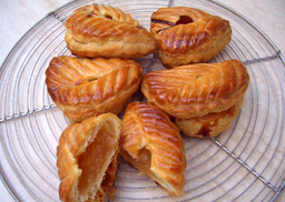 ショソンって室内履の靴とかスリッパって意味ですよね?楕円形にしたフイユタージュに何か詰め物をして二つ折りにして焼いたものの形がスリッパの先端部分?ん?なんて言ったらいいんだろ??足を入れる部分っていうか・・・の形に似てるからついたとか。。。ショソンっていろんなものがありますよねぇ〜。シュー生地とクレーム・パティシエールを混ぜたものとラム酒漬けレーズンを詰めてるものとか、ひき肉が入ってる甘くないものとか。