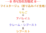 シブーストってりんごで作るのがオーソドックスのような気がしますけど、例えば オレンジをキャラメリゼしたものと、カスタードクリームを牛乳ではなくてオレンジジュースで作ったものを使ってのオレンジ風味とか・・・・いろんなフルーツで応用できそうですね!!