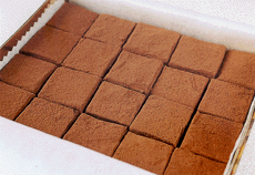 K: 手をかけるところが少ないので、失敗も少ない。 出来上がりを包丁で切るだけにしてるからね。同じようなものでも、絞ったり丸めたりすると、そのときにさわりすぎて状態が変わることがある。だから今回は、包丁で四角く切るだけで、ココアをまぶして、出来上がりです。で、チョコレートを固めるための型も別にこれにあわせて買ったりしなくても、お気に入りの箱を用意して、汚れないようにラップでもしいてその中に流してもいい。先に箱を用意して、そこに流して形を決めてあと小さくカットすれば、端を切ることもないのでロスが少なくなっていいんじゃないかな。 あと注意して欲しいのは、暖かいところに置いておかないこと。生チョコは夏場は特に冷蔵庫に入れておかないとすぐに柔らかくなっちゃう。 |