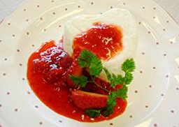 きゃっ!!可愛いじゃない〜。これからの時期にぴったりのデザートよね。白のクリームに赤いベリー類のジャムやフルーツを添えちゃって、形もハートで素敵!!代表的な材料はえっと・・・ 確かフロマージュ・ブランだよね?フロマージュ・ブランの話は確か麻紀先生の“いちごとヨーグルトのムース”でしたよね?話にはあったけど今回菓子まし初登場だったりして?!
