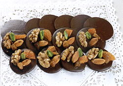 N:今回はイチジクはのせてないんだけど、くるみ、アーモンド、干しぶどう、ピスタチオ、乾燥アプリコットを使ってます。もちろん干しイチジクが手に入れば使えばいいけど、名前の由来にそんなに気にすることなく、オレンジピールや、ドレンチェリー、その他色々なナッツを使ってもいいんじゃないかな!でも、チョコレートには水分が大敵なのでくれぐれも 生のフルーツは使わないでね!!
