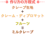 | H : 今回は、「クレーム・ディプロマット」と、3種類のフルーツをあわせました。もちろんフルーツ抜きでも、クレーム・パティシエールだけでもおいしいよね。色々と工夫して、自分だけのオリジナル・ミルクレープに挑戦してみましょう!! |