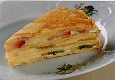 H : そうねえ。あんまり分厚いと生地の中心の部分がモチモチしすぎてクリームとのバランスが悪くなっちゃうかな。でも、反対に薄すぎるとクリームを塗り広げたりする時に破けてしまうし……。ほどほどの厚みで。今回紹介している分量で、直径18cm位のものが8枚から10枚焼けるぐらいね。 |