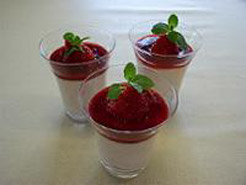 K: これはいちごをミキサーでつぶして、裏漉しして種を取ったもの。いちごの甘味しだいで砂糖やレモン汁などを加えてみて。もちろん面倒ならジャムをたらすのもいいかも。ひと手間かけるならホイップクリームを絞ってその周りにソースを流すのも・・・・仕上げは好みで楽しく作ってみて!! |