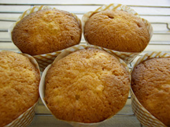 治代(以下H): 「マフィン」!!懐かしいなあ。数年前に長野で知り合ったケベック人のCATHY(カティ)がよくバナナマフィンを作ってくれたなあ!!作り方は、意外と簡単。「イングリッシュマフィン」のように発酵させたりする手間もないし、特別な型もいらないし‥‥