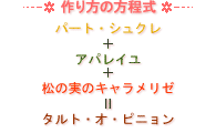 今回は、とろーんと口当たりのいい、クレーム・ブリュレ。さくっとしたパート・シュクレと、カリカリ香ばしい松の実との相性がバツグンです。それにしてもみんな、「健康」について詳しいね!!あっ、でも松の実はカロリーが高いんだよね(ちなみに10gで69kcal)。おいしいからって食べ過ぎに注意!!