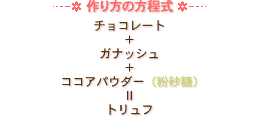 | K : そう、“テンパリング”っていう溶かしたチョコレートの温度を調節する作業が必要なんだよね。で、それが必要だとわかると今度は面倒で気軽には作れない…。 |