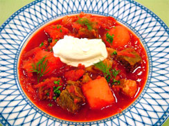| さて今回の「ボルシチ」ですが、作るのに時間は少し長くかかるのですが、作り方はなるべくかみ砕いて易しくしてみました。でき上がりの味は、一流レストランと比べても引けをとらないと自負しています。冬の寒いときに、是非一度お試し下さい。できれば以前に紹介しました「ピロシキ」と共に食卓に並べて頂ければ幸いです。 |