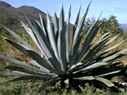 プルケの原材料は、アロエを大きくしたような形の竜舌蘭(リュウゼツラン)の一種であるマゲイMAGUEYという植物です。マゲイは、古代文明の頃から日常的に使われる一方で、メキシコでは神聖な植物とされ、宗教儀式や祭りにも欠かせないものだったといいます。葉は固く腐りにくいので家の屋根に使ったり、また肉厚な葉は繊維を取り出して布を織ったり、葉の先の棘は縫い針にしたり、植物全体が生活に利用されてきたそうです。プルケはこの植物の中心部にたまる樹液、つまりアグア・ミエルAGUAMIELと呼ばれる蜜水から作られます。これをアココテと呼ばれる細長く巨大なひょうたんで吸い取って集め、ティナカル(プルケ製造所)へ運び、大桶の中で7〜14日間発酵させるとプルケになります。今日でもその消費量は、メキシコで飲まれる総アルコール量の1/4を占めると言われています。