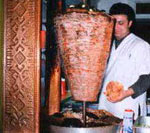 またタケリア(Taqueria)と呼ばれるタコス屋で人気のあるメニューの一つとして、「羊飼い風」と呼ばれているアル・パストール(Al pastor)があります。薄切りにして調味した肉片を幾層にも重ねて心棒に突き刺しながら巻き付け、直径30cm、高さ約1mくらいの肉塊を作り、横からの火で焙り、回転させながら焼くものです。焼けた肉をナイフで削り落としながら、トルティージャで巻いて食べます。元はトルコのドネル・ケバブと思われますが、意外に広まっています。 |