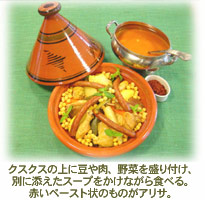 | 同じマグレブ社会とは言え、それぞれに味の好みの違いがあり、モロッコでは辛さを控えてサフランで色や香りをつけ、チュニジアではアリサと呼ばれる唐辛子やにんにく、その他のスパイスをペースト状にしてオリーブ油と混ぜ合わせた薬味を好みで混ぜ込んで食べるのが一般的です。日本ではまだまだ馴染みの少ない料理ですが、一度お試し下さい。 |