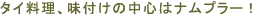 タイ料理を語るにあたって、避けて通れないのは何と言ってもナムプラーでしょう。魚介を原料とする発酵調味料の一種で、その言葉の意味はタイ語では、ナム=汁、プラー=魚、でそのまま魚の汁という意味ですね。塩味とアミノ酸のうま味を持ち、日本では秋田のしょっつるや能登のいしる、中国の魚露、ベトナムのヌクマムなどと同じ仲間です。ナムプラーを選ぶときは、まず色を見て薄く透明度が高いもの、次に臭いをかいで魚臭が控えめなもの、もし味見が出来るのであればえぐみが無くうま味を強く感じる物ほど質が良く、タイ料理全体を風味豊かなものに仕上げてくれます。