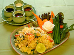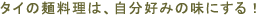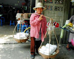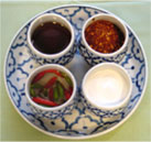 ここでちょっと麺類屋に行った時の注文の仕方について、お話をしておきましょう。まずは先にあげた麺から好みの種類を指定します。そして次に調理法を指定しますが、汁かけ麺であればナーム、汁無しならばヘン、あんかけであればラート・ナ、炒め物であればパッ(ト)と言います。最後に好みの具、すり身団子や焼き豚、ハンペンなどを注文します。たった一杯の麺料理を食べるだけでこれだけの意思表示をしなくてはいけませんが、言葉ができなくても指で示すだけでも通じることでしょう。あとは食べるだけなのですが、麺料理は一般的に薄味で調味されていますので、卓上に置いてある4種類程度の調味料を自分の好みに合ったように振りかけてから食します。酢(とうがらし入り)、ナムプラー、砂糖、プリックポン(種入り粗挽きとうがらし)などがあります。 |