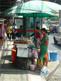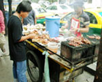 次にリヤカーを自転車やバイクで引っ張りながら移動する屋台。大きなビーチパラソルを広げ、日中の強い陽射しや一時的なスコールを防ぎながら様々な食べ物を売っています。炭火の上で串刺しにしたルクチン(肉や魚などのすり身団子)を焼き鳥のように焼き、甘辛いタレをつけて売る店。プロパンガスで大鍋に丸のまま鶏肉を入れてスープをとり、そのスープでご飯を炊いて鶏肉を添えて売っているカオ・マン・ガイ屋さんなど。実に、様々の食べ物が手際よく調理されて、そこに来るお客のニーズに応えています。 |