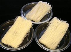 さて、今回はタイ風焼きビーフンを紹介しますが、ご存知の通りビーフンはお米を原料とした麺でクイッティャオと呼ばれ、その太さの違いでさらに呼び名が変わります。セン・ミーと呼ばれるのは細麺で、今回使用しますのはセン・レックと呼ばれる中細麺、それに幅広麺のセン・ヤイなどがあります。また日本のラーメンと同じ、小麦粉から作られたバーミーもよく食されています。 |