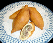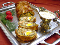 さて今回はパイ生地を使って「サーモンのクリビヤーカ」を作りましょう。ロシア語としては「クレビャーカ」と言われている料理ですが、ピローグ(ロシア風パイ包み料理、またはパン包み料理)の変形で、決まった形があるわけではなく、背を高く作るか、または細長い棒状に作ることが多い料理です。外側はパン生地やパイ生地で覆い、中身は鶏肉や牛挽き肉、あるいは今回のようにサーモンという主材料を中心に、ご飯、火を通したキノコやキャベツ、ゆで卵などを詰め、表面に溶き卵を塗ってオーブンで焼き上げるもので、宴会料理を華やかに演出する逸品になります。多くの人が集まるパーティーではメインディッシュとして作り、お客様の目の前で切り分けてすすめてください。また小さくして作れば、以前紹介しましたピロシキにもなり、お子様のおやつとしてもおすすめできます。